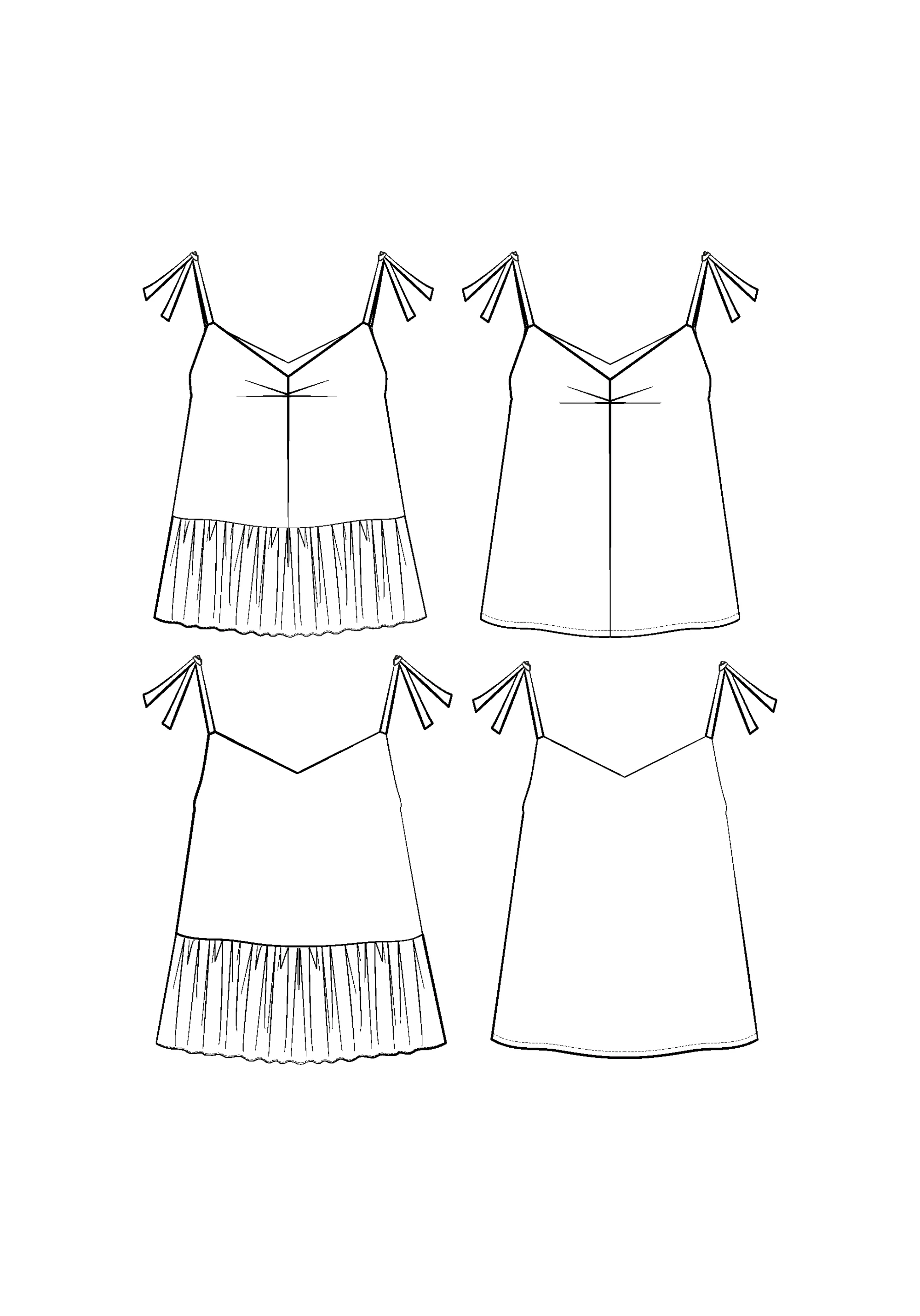 Belle Épine est un petit top au charme bohème et à l’allure résolument estivale. Délicat et très féminin, il se distingue par son détail de pinces qui rayonnent sur la poitrine, son décolleté en V devant et dos (dont l’échancrure permet de porter un soutien gorge), ses jolies bretelles à nouer et son volant en forme et froncé. Le patron est entièrement doublé, et le top du dessous est construit avec des pinces poitrines classiques. Une version sans doublure est également possible grâce à des pièces propreté encolure. Parfait compagnon pour les chaudes journées d’été, le patron se décline en plusieurs versions: avec ou sans volant, avec ou sans doublure, afin que vous puissiez décliner à l’envi votre modèle. Ce patron de couture est très facile à coudre, avec de jolies finitions, bref… Irrésistible !